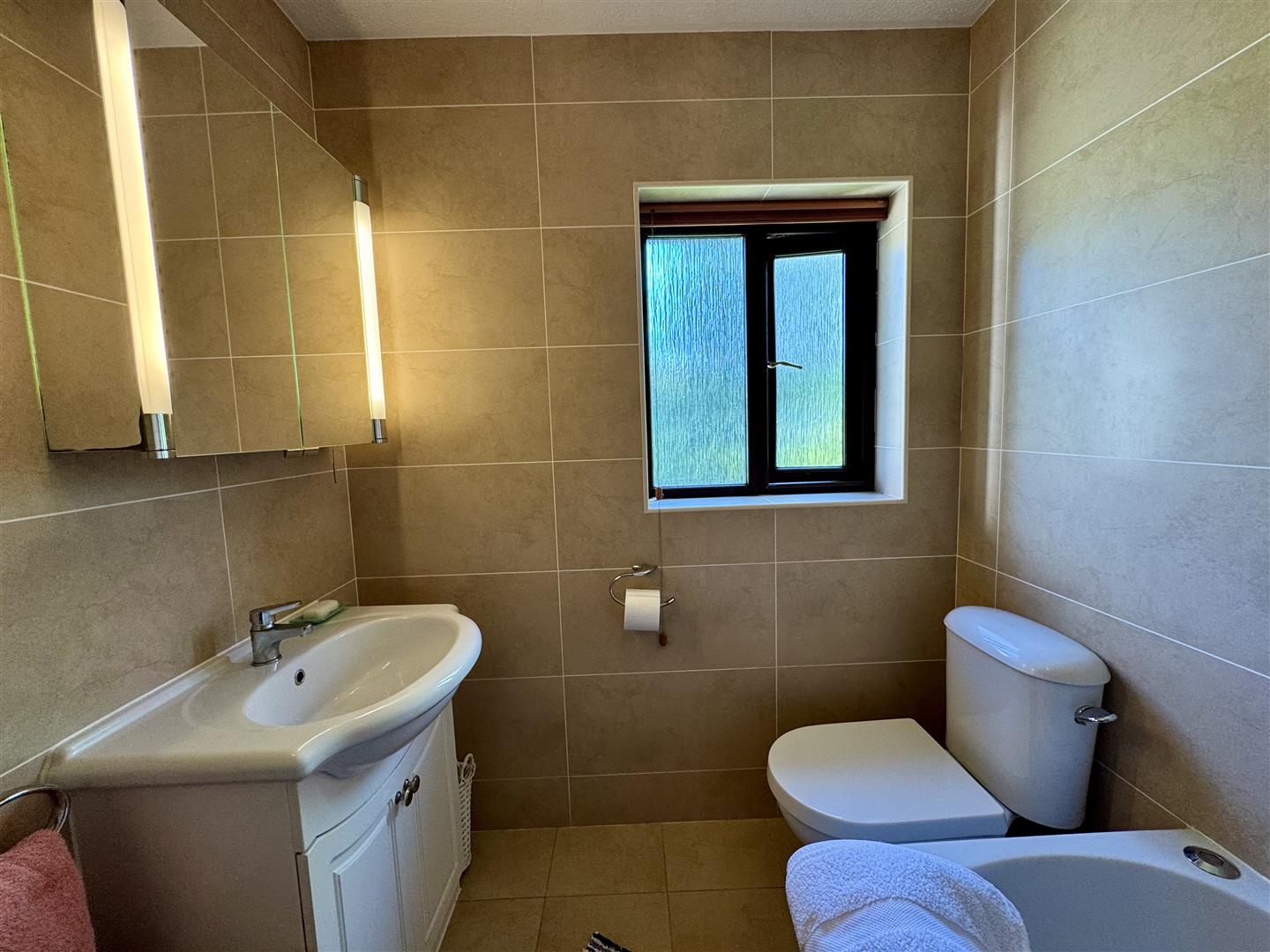 Fitted with a white suite to include low level W.C., wash hand basin with chrome mixer tap set over vanity storage unit with mirrored cabinet and lighting over. Shower Jacuzzi bath with screen and mains fed shower over. Full tiling to walls. Ceramic tiled floor. Chrome towel radiator. Extractor fan. Opaque UPVC double glazed window to rear elevation.