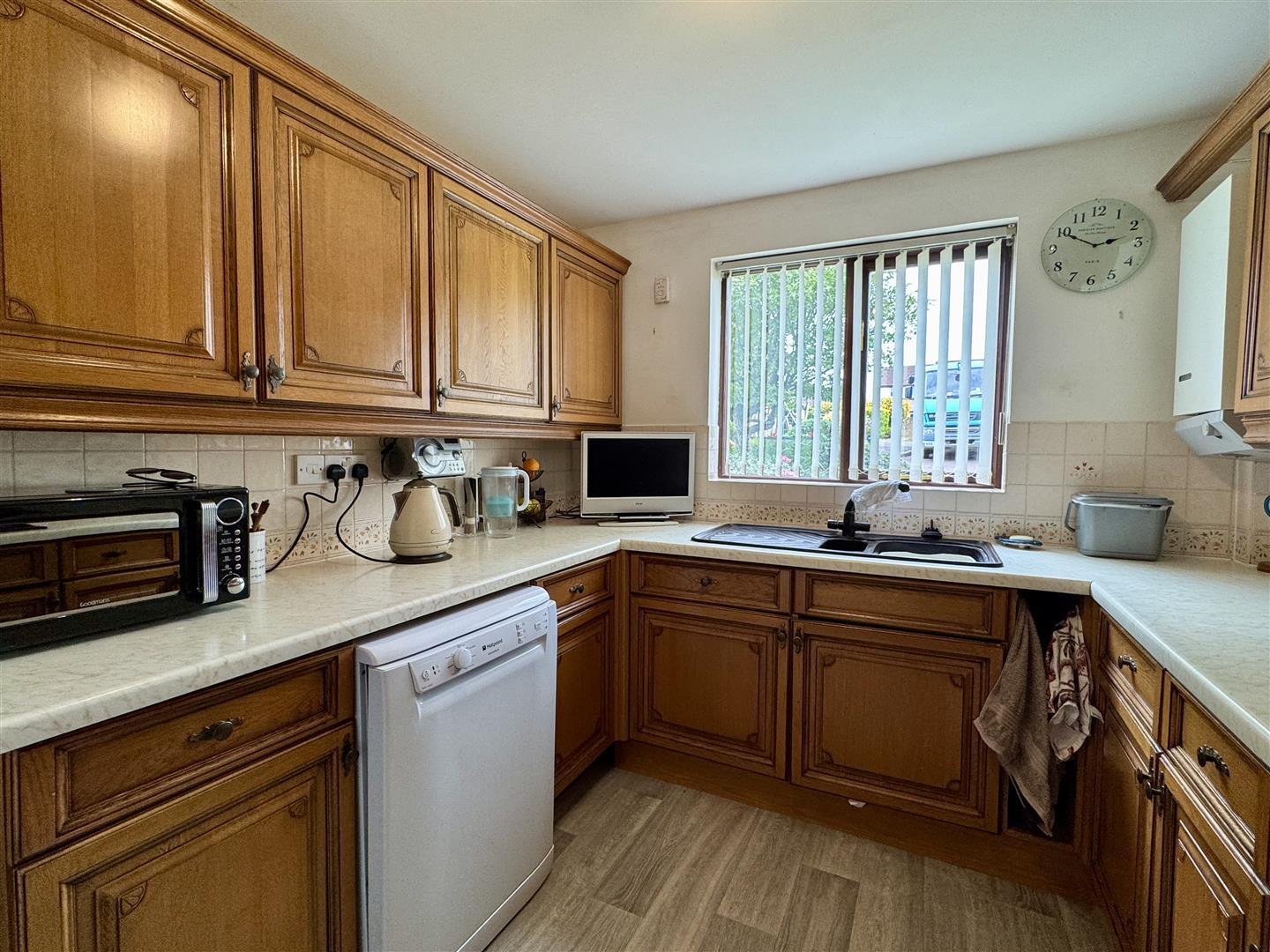 Base unit and work surface over with stainless steel sink and mixer tap plus splash back. Serving hatch to dining room. Wood effect flooring. Panelled radiator. Glazed and panelled door to side elevation.