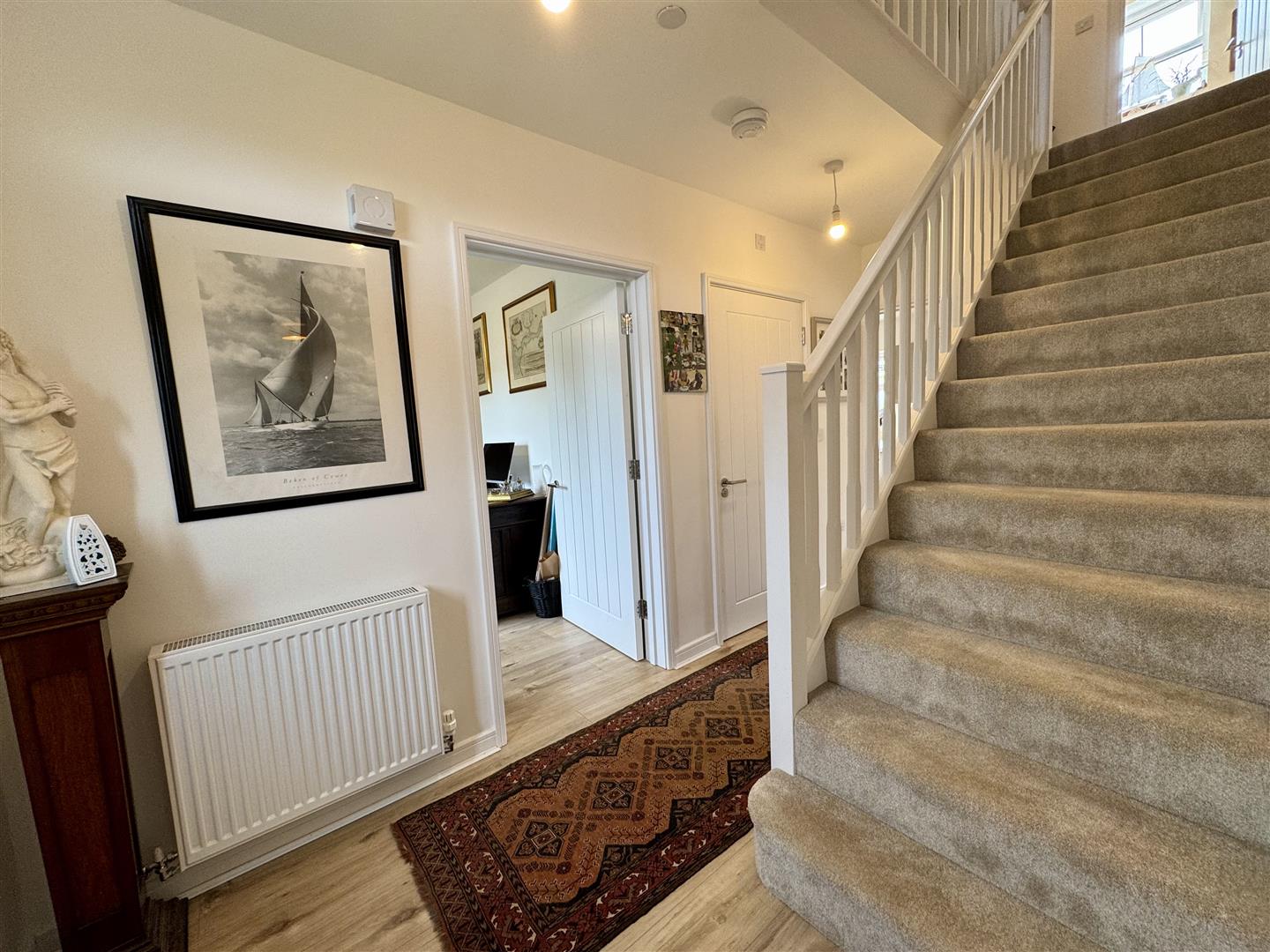 Approached via composite panelled door. Understairs storage cupboard. Good quality wood effect flooring. Panelled radiator. Stairs to first floor landing. Doors off.