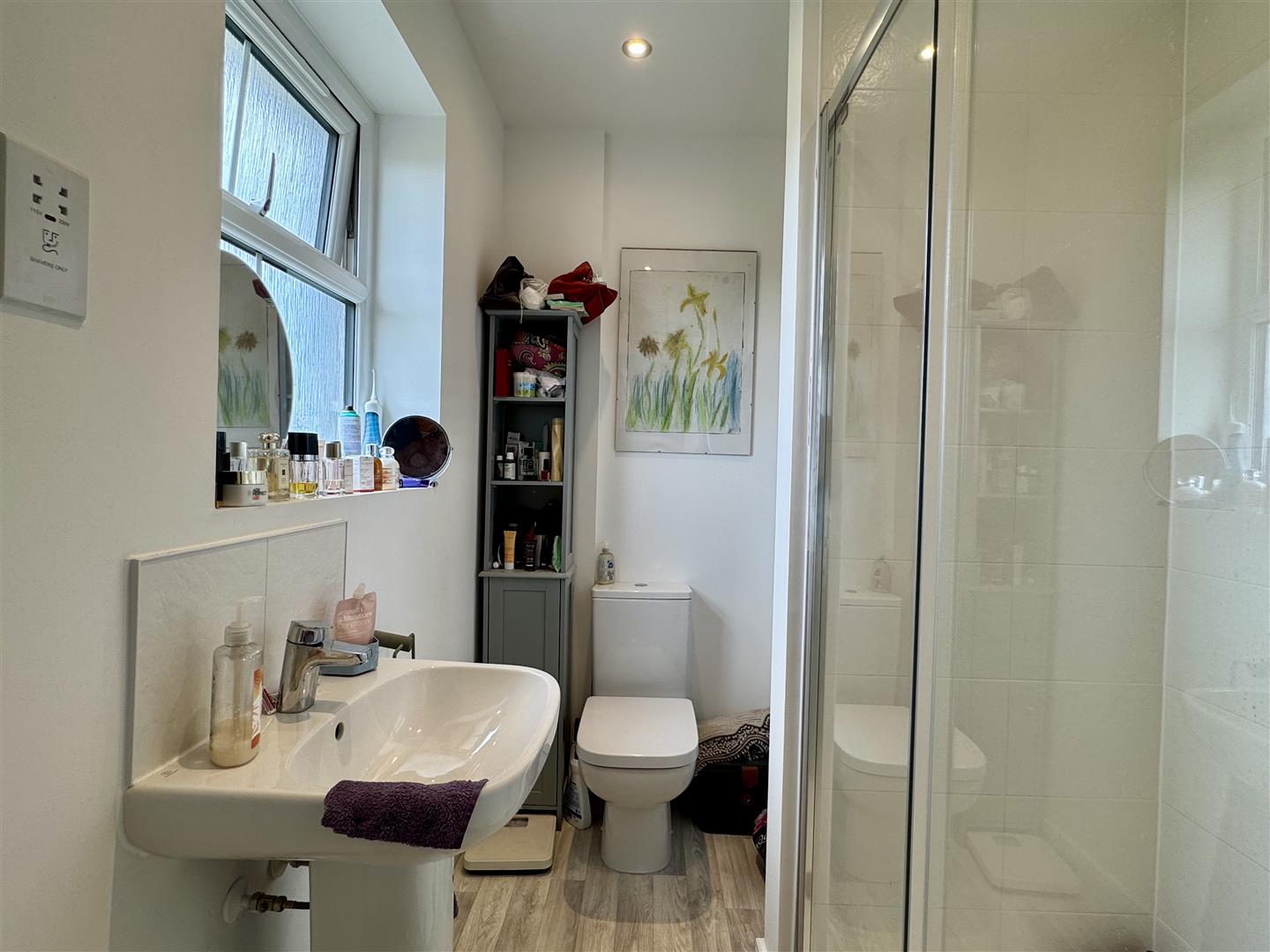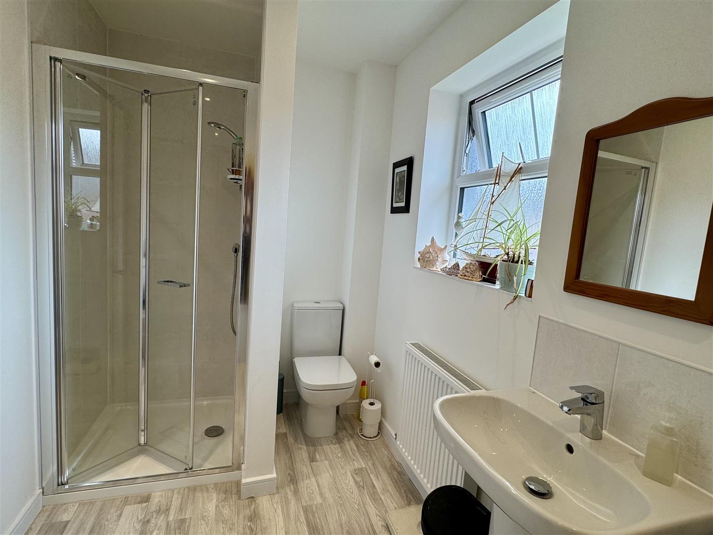 Inset spotlighting. Low level W.C. pedestal wash hand basin with chrome mixer tap and tile splash back. Shaver point. Step in enclosure with mains fed shower. Chrome towel radiator. Good quality wood effect flooring. Opaque UPVC double glazed window to front elevation.